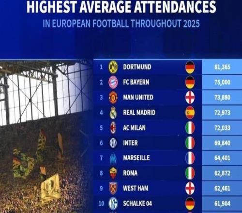 • 2025年欧洲俱乐部场均上座人数:多特、拜仁、曼联前三