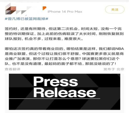 “感谢所有球迷的支持,能穿上NBA的球衣站上赛场,本身就是一种骄傲。接下来,小曾会回到美国专注恢复,并评估接下来的计划。”