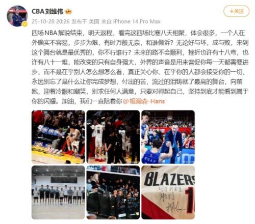 北京时间10月28日,青岛男篮主帅、杨瀚森恩师刘维伟更新社媒,表示自己结束了8天4场NBA比赛的解说之旅,他见证了杨瀚森NBA生涯前4场比赛。刘维伟也是寄语杨瀚森,告诫他未来之旅不会顺利,需要变得更加强大,每一天都需要进步,也表示真正关心和在乎杨瀚森的人,会一直陪着他。